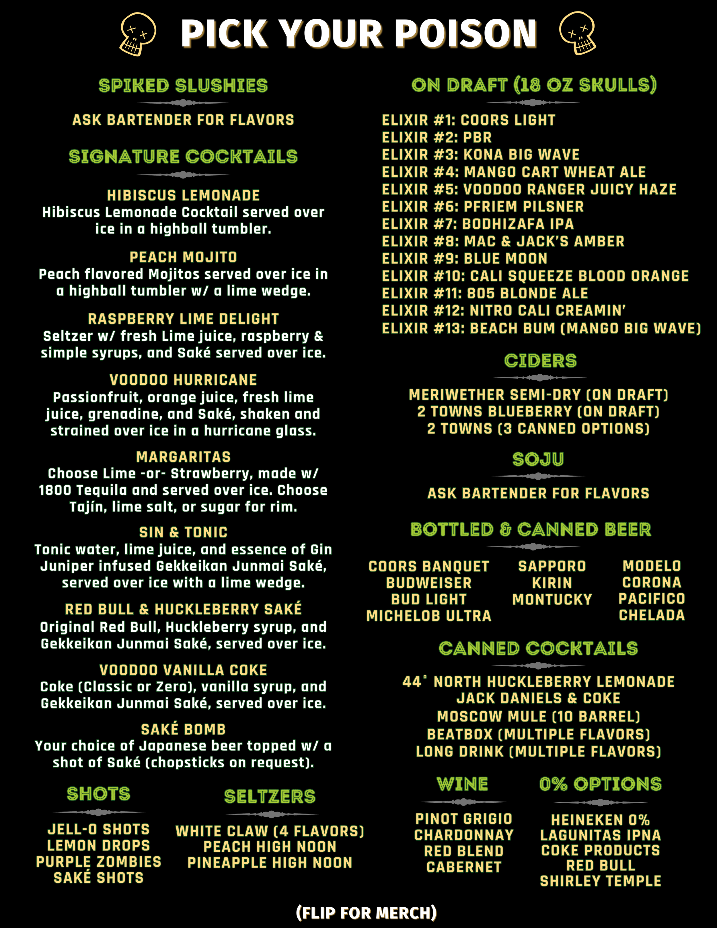 Voodoo Cellar Boise is more than just tons of beers & ciders on tap, we’ve got amazing handcrafted cocktails, shots, seltzers, and many more options that will appeal to absolutely anyone’s palate! We even have custom merch that includes shirts, hoodies, tank tops, baseball caps, beanies, stickers, patches, and more!